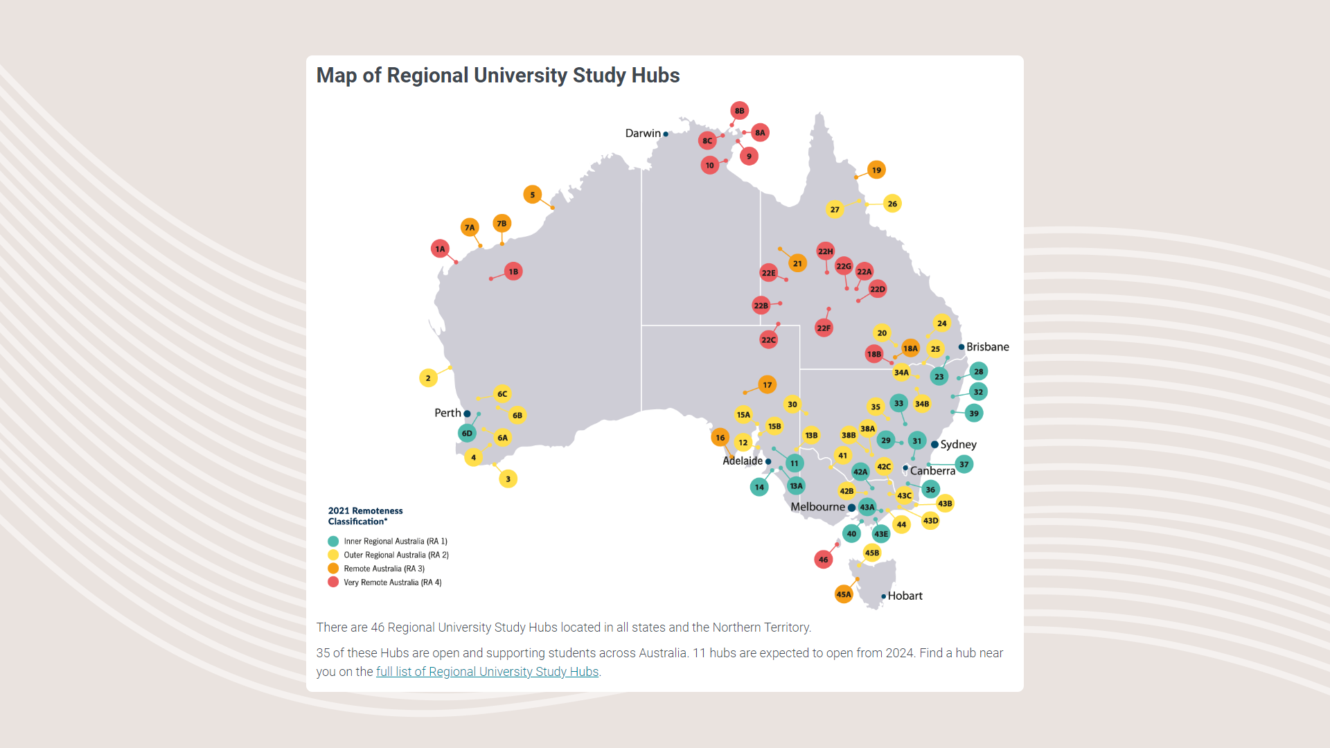 These are in addition to the 34 existing Regional University Study Hubs located across the country. The evidence shows that where they are, university participation and completion increases.